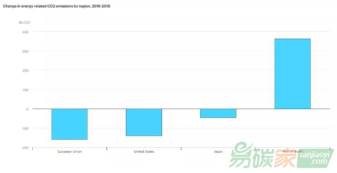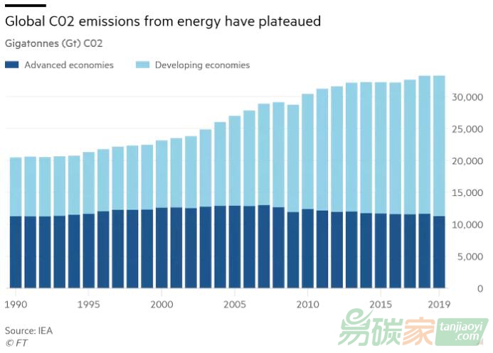 碳排放量在經(jīng)過兩年的增長后,2019年排放量為330億噸左右,與上一年持平。這主要是由于發(fā)達經(jīng)濟體
