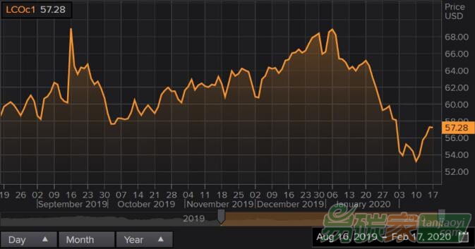 圖1:截至2020年2月17日布倫特原油價(jià)格(數(shù)據(jù)來源:Refinitiv Eikon)