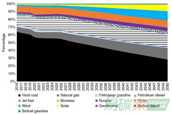一整套政策體系下的不同燃料類型的一次能源消耗。