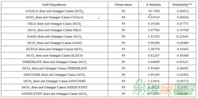 Grange因果分析常用于時間序列分析,該方法不僅有助于指示兩個變量之間影響的維度,而且能夠評估變量之間的動態(tài)關(guān)系。格蘭杰因果關(guān)系方法的結(jié)果可以是單向的,雙向的或中性的關(guān)系。本文選取1952—2012年時間序列數(shù)據(jù),采用Grange因果分析方法,檢驗不同能源消耗與二氧化碳排放間的關(guān)系。結(jié)果如下表: