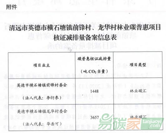 附件:清遠(yuǎn)市英德市橫石塘鎮(zhèn)前鋒村、龍華村林業(yè)碳普惠項目核證減排量備案信息表