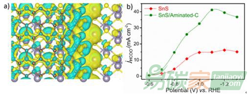 (a)SnS/Aminated-C復(fù)合催化劑的差分電荷分布圖;(b)CO2RR活性電流密度對比圖(陳志鵬 供圖)