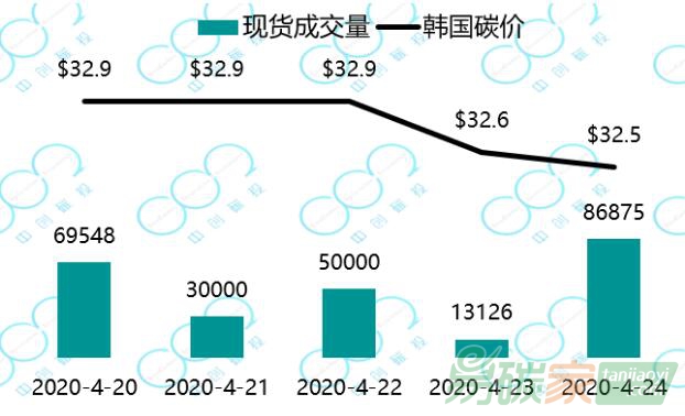 2020年4月20日至2020年4月24日,韓國碳價小幅下跌至32.5美元每噸。受疫情影響,韓國碳市場主管部門將履約期限延長了一個月至2020年7月31日。
