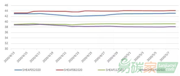 本報(bào)告期內(nèi)(2020年5月6日至2020年5月8日),上海碳配額遠(yuǎn)期中央對(duì)手清算業(yè)務(wù)保持平穩(wěn)運(yùn)行。遠(yuǎn)期市場流通協(xié)議價(jià)格除2020年8月協(xié)議以外小幅上揚(yáng),近端與遠(yuǎn)端協(xié)議仍存在一定價(jià)差。其中,2020年5月協(xié)議期末結(jié)算價(jià)43.18元/噸,較節(jié)前最后一個(gè)工作日上漲0.20元/噸,2020年8月協(xié)議期末結(jié)算價(jià)44.14元/噸,較節(jié)前最后一個(gè)工作日下跌0.02元/噸。