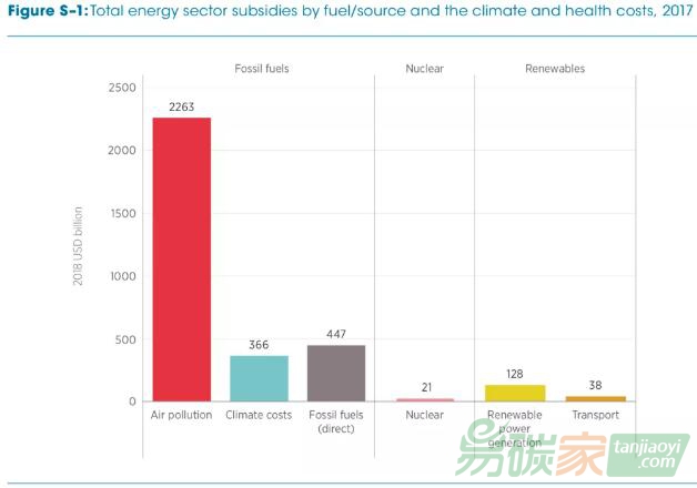 國際可再生能源署(IRENA)發(fā)布報告,估計2017年全球各國為能源部門提供的直接補貼至少為6340億美元。其中,4470億美元補貼給化石燃料(占比70%),1280億美元給可再生能源發(fā)電,380億美元給可再生能源生物燃料(可再生能源補貼占比26%)。各國對于核能的補貼缺乏數(shù)據(jù),但匡算為210億美元。如果考慮到化石燃料的外部性成本,全球對于能源部門的補貼將大幅上升至3.1萬億美元,其中化石燃料的空氣污染成本高達2.3萬億美元、氣候變化成本3660億美元。