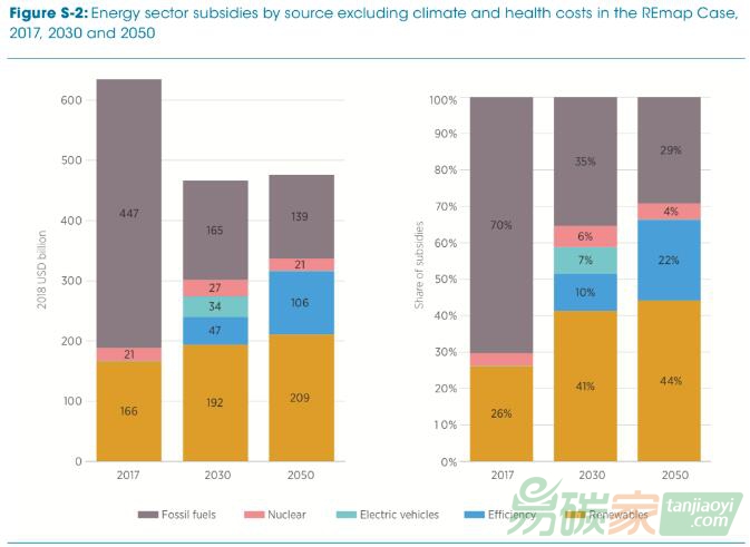 補貼下降的原因主要是各國對化石燃料直接補貼大幅度減少,將從2017年的4470億美元下降到2030年的1650億美元,2050年下降到的1390億美元。預計到2050年90%以上的化石燃料補貼僅用于支持工業(yè)應用中的二氧化碳捕獲和儲存。隨著可再生能源發(fā)電的競爭日益激烈,特別是對太陽能光伏發(fā)電的早期高成本補貼到期,2030年可再生能源發(fā)電補貼降至530億美元,到2050年基本取消,屆時對可再生能源的補貼主要是可再生能源在其他領域的應用。