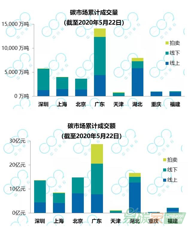 截至2020年5月22日,全國CCER累計成交2.2億噸。其中上海CCER累計成交量持續(xù)領跑,達9761萬噸,占比44%;廣東CCER累計成交4653萬噸,排名第二,占比21%;北京、深圳和