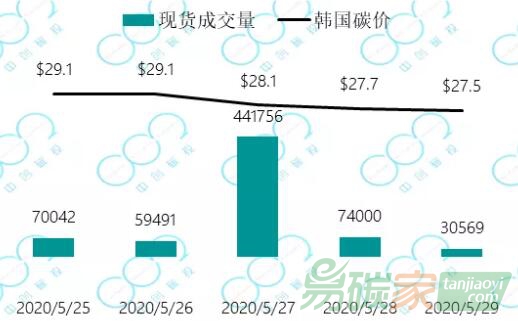2020年5月25日至2020年5月29日,韓國(guó)碳價(jià)自29.1美元下跌至27.5美元每噸。