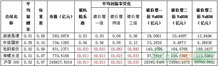 表1對(duì)結(jié)果進(jìn)行了摘要說(shuō)明。值得注意的是,綠色股票(環(huán)保、新能源行業(yè)等,例如啟迪桑德、中信國(guó)安)碳風(fēng)險(xiǎn)系數(shù)趨向于為正,而兩高一剩等行業(yè)(例如包鋼股份、海螺