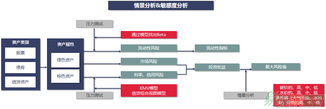 中財(cái)綠金院創(chuàng)新在敏感性分析中納入環(huán)境因子,通過(guò)數(shù)據(jù)找出環(huán)境風(fēng)險(xiǎn)與收益率之間的關(guān)系,亦即環(huán)境風(fēng)險(xiǎn)增加一單位對(duì)于收益率的影響幅度。例如,碳價(jià)上漲1%影響資產(chǎn)收益率下跌的百分比,就是碳風(fēng)險(xiǎn)系數(shù)值;排污費(fèi)(大氣、水)上漲1%影響資產(chǎn)收益率下跌的百分比,就是污染排放風(fēng)險(xiǎn)系數(shù)值。針對(duì)債券和信貸資產(chǎn),通過(guò)一系列模型找出其相應(yīng)的風(fēng)險(xiǎn)系數(shù)值,可以衡量出其利率風(fēng)險(xiǎn)和信用風(fēng)險(xiǎn)。針對(duì)股票,其分析思路基本相同,區(qū)別在于通過(guò)模型計(jì)算出來(lái)的風(fēng)險(xiǎn)系數(shù)值衡量的是流動(dòng)性風(fēng)險(xiǎn)和
