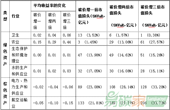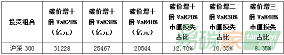 水泥)碳風(fēng)險(xiǎn)系數(shù)趨向于為負(fù),表明兩高一剩行業(yè)的碳風(fēng)險(xiǎn)敞口明顯高于環(huán)保行業(yè)。而滬深300(281家上市公司)投資組合的碳風(fēng)險(xiǎn)系數(shù)值為-0.0088,所以碳價(jià)升高會(huì)對(duì)股票回報(bào)率產(chǎn)生負(fù)面影響,滬深300存在碳價(jià)風(fēng)險(xiǎn)敞口。而在VaR方面,在碳價(jià)上升1倍時(shí),在5%極端風(fēng)險(xiǎn)產(chǎn)生時(shí),投資組合(滬深300)因?yàn)樘硷L(fēng)險(xiǎn)而發(fā)生的市值損失高達(dá)2.6萬(wàn)億元,約占其總市值(25萬(wàn)億)的10%,亦即因?yàn)樘純r(jià)上漲一倍,滬深300指數(shù)有5%的機(jī)率產(chǎn)生2.6萬(wàn)億元市值損失。