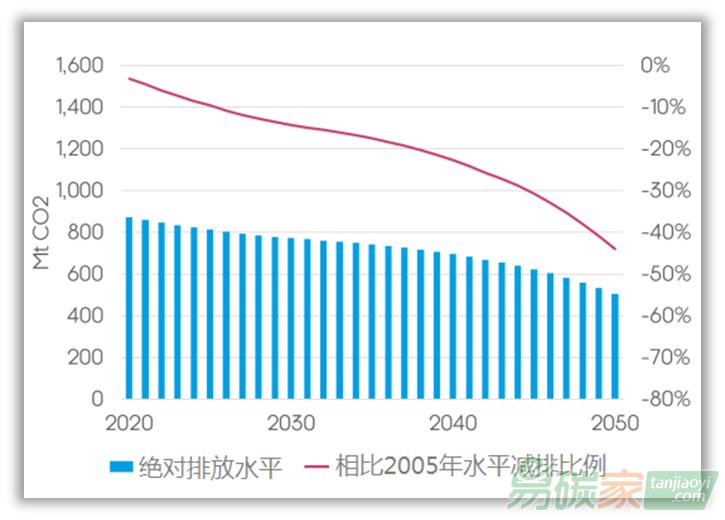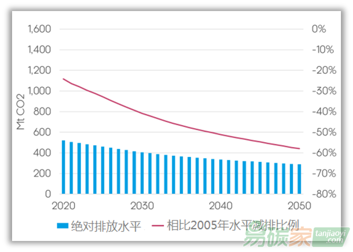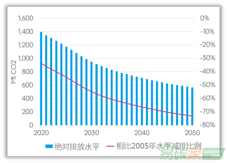 到2030年公路交通排放預(yù)計將比2005年水平低14%左右;而建筑物(主要為采暖)排放將比2005年水平低34%。到2050年公路交通和建筑排放預(yù)計分別低于2005年水平的37%和41%,絕對CO2排放分別略高于5.5億噸和4億噸。