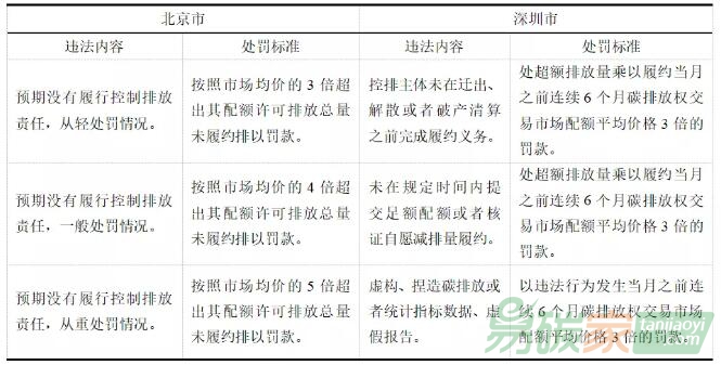 資料來(lái)源:作者根據(jù)《北京碳排放權(quán)交易行政處罰自由裁量權(quán)參照?qǐng)?zhí)行標(biāo)準(zhǔn)試行》和《〈 深圳市碳排放權(quán)交易管理暫行辦法〉行政處罰自由裁量權(quán)實(shí)施標(biāo)準(zhǔn)》整理而得;
