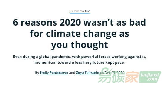 據(jù)Grist.org網(wǎng)站發(fā)表文章,題目是:6 reasons 2020 wasn’t as bad for climate change as you thought (“6個(gè)原因:2020年對(duì)氣候變化的影響不像你想象的那么糟糕”,作者Emily Pontecorvo and Zoya Teirstein)