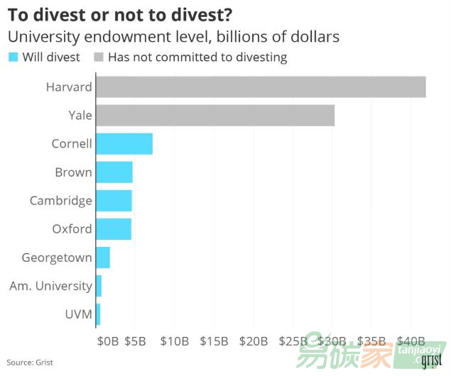 著名的學(xué)校如英國的牛津、劍橋大學(xué),美國的喬治敦、布朗、康奈爾大學(xué),加入了越來越多的大學(xué)和大學(xué)計(jì)劃剝離給他們捐贈(zèng)的化石燃料公司。美國最富有的兩所大學(xué),哈佛大學(xué)和耶魯大學(xué)的壓力越來越大,這兩所大學(xué)的捐贈(zèng)總額達(dá)到720億美元。盡管這兩所學(xué)校都沒有承諾撤資,但哈佛大學(xué)宣布了一項(xiàng)仍然模糊的計(jì)劃,即到2050年將來自化石燃料公司的捐贈(zèng)額降至零,并聲稱它將能夠與化石燃料公司合作實(shí)現(xiàn)這一目標(biāo)。