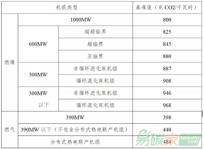 電力行業(yè)燃煤燃?xì)獍l(fā)電機(jī)組(含熱電聯(lián)產(chǎn)機(jī)組)使用基準(zhǔn)線法分配配額,對(duì)單位產(chǎn)品的二氧化碳排放量設(shè)置標(biāo)準(zhǔn)。計(jì)算公式為:控排企業(yè)碳排放配額=產(chǎn)量×基準(zhǔn)值(見表1);新建項(xiàng)目企業(yè)碳排放配額=設(shè)計(jì)產(chǎn)能×基準(zhǔn)值(見表1)。特殊燃料發(fā)電機(jī)組(如煤矸石、油頁巖、水煤漿、石油焦等燃料)以及供熱鍋爐采用歷史強(qiáng)度下降法分配配額,即要求排放單位年度碳排放強(qiáng)度與自身的歷史碳排放強(qiáng)度相比有所下降。