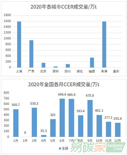 各試點(diǎn)市場中,2020年CCER成交量最高的兩個(gè)城市分別為天津與上海,其次為廣東、