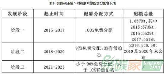 韓國(guó)碳市場(chǎng)交易分三個(gè)階段進(jìn)行,分別是階段一(2015—2017年)、階段二(2018—2020年)和階段三(2021—2025年)。三個(gè)階段的配額分配從免費(fèi)過(guò)渡到以免費(fèi)分配為主、有償拍賣為輔的方式。每個(gè)階段具體的配額分配方式及總量見(jiàn)表1。從表1中的配額總量信息可以看出,從2015年到2018年的配額總量是逐年減少的。