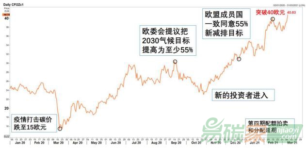 圖1 2020年至今歐洲碳價(jià)走勢 (EUA12 月份期貨,歐元/噸)