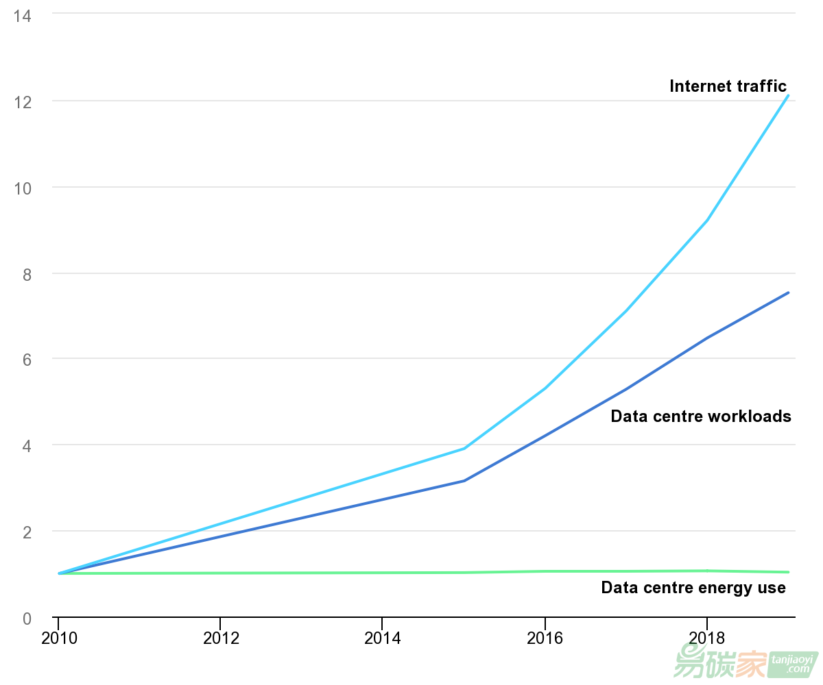 根據(jù)國(guó)際能源署(IEA)數(shù)據(jù),過(guò)去十年(2010-2019年),全球互聯(lián)網(wǎng)流量增長(zhǎng)了11.1倍,數(shù)據(jù)中心工作負(fù)載增加了6.5倍,而數(shù)據(jù)中心能耗卻僅增長(zhǎng)了6%。 盡管數(shù)據(jù)中心為更多的人提供了更多的服務(wù),但仍保持占全球用電量的1%左右,與2010年持平。 如下圖所示。