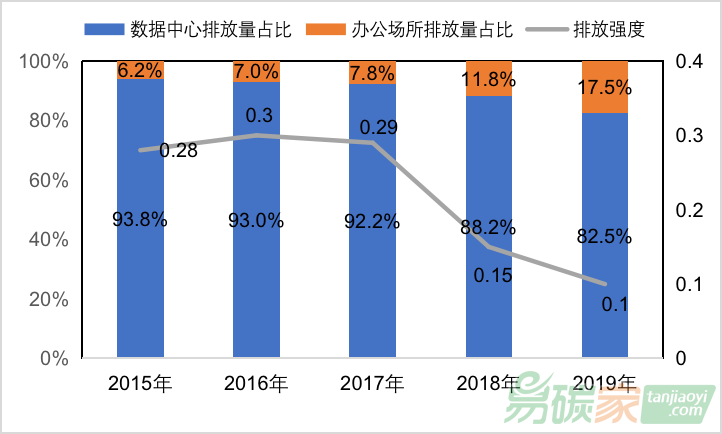 各公司的數(shù)據(jù)也證明了超大規(guī)模數(shù)據(jù)中心的效率優(yōu)勢(shì)。 根據(jù)谷歌公司發(fā)布的數(shù)據(jù)(2020),其數(shù)據(jù)中心的能源效率是典型企業(yè)數(shù)據(jù)中心的2倍。 與五年前相比,谷歌以相同的電量提供大約7倍的計(jì)算能力。 Facebook所擁有的數(shù)據(jù)中心數(shù)量由2015年初的4個(gè)增加到2019年底的15個(gè)。 而數(shù)據(jù)中心排放量占比持續(xù)下降,由2015年的93.8%下降至2019年的82.5%。 其排放強(qiáng)度已降至0.1,用戶使用Facebook一年所產(chǎn)生的