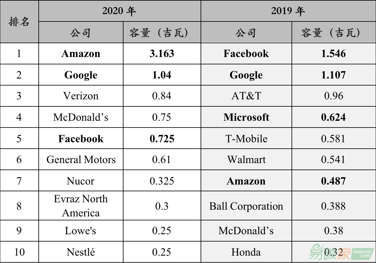 互聯(lián)網(wǎng)公司是最大的可再生能源采購(gòu)商。 根據(jù)REBA( 可再生能源購(gòu)買(mǎi)者聯(lián)盟 )數(shù)據(jù),2020年美國(guó)十大可再生能源采購(gòu)商中,有亞馬遜、Google和Facebook三家互聯(lián)網(wǎng)公司入圍,分居第一、第二和第五位。 三家公司共采購(gòu)4.928吉瓦可再生能源,占全美總采購(gòu)額的46.5%。 2019年有Facebook、Google、微軟和亞馬遜4家互聯(lián)網(wǎng)公司入圍前十名。 四家公司共采購(gòu)3.764吉瓦可再生能源,占全美總采購(gòu)額的40%。 值得注意的是,全美可再生能源采購(gòu)商的前二位連續(xù)兩年都是互聯(lián)網(wǎng)公司。 如下表所示。
