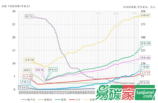 碳排放總體規(guī)模可以看出,“能產(chǎn)比”,即當(dāng)年能耗與當(dāng)年GDP產(chǎn)值的比率,從60年代到90年代迅速降低,到了1994年后基本拉平。2008年以后基本沒(méi)有什么大的改進(jìn),當(dāng)然有因?yàn)榧夹g(shù)提升帶來(lái)較小程度的改進(jìn),目前我們還不知道這是不是就是最低線。