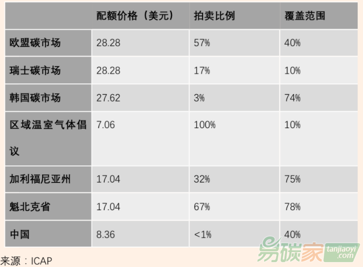 對比國際成熟碳市場的關(guān)鍵性指標(biāo),比如配額價格、拍賣比例和覆蓋范圍,我們可以發(fā)現(xiàn),各個