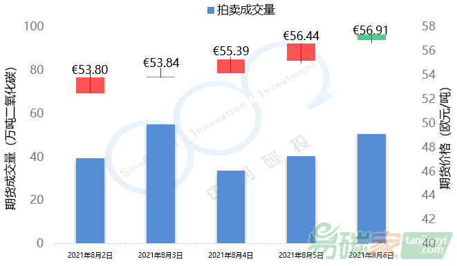 2021年8月2日至8月6日,本周由于天然氣價(jià)格的持續(xù)走強(qiáng),歐盟碳價(jià)與英國碳價(jià)經(jīng)歷了不同程度的上漲,歐盟碳價(jià)由54.37歐元/噸上漲至56.61歐元/噸,漲幅為4%。英國碳價(jià)波動(dòng)則相對(duì)較大,由53.80歐元/噸上漲至56.91歐元/噸,漲幅為6%,反超歐盟碳價(jià)。本周歐盟碳市場期貨成交量為1.21億噸。此外,由于歐盟委員會(huì)修訂了2021-2022的拍賣日歷,部分拍賣配額納入市場穩(wěn)定儲(chǔ)備(MSR),歐盟配額拍賣量在本周幾乎減半,縮減為755萬噸。英國碳市場本周拍賣成交量為219萬噸。
