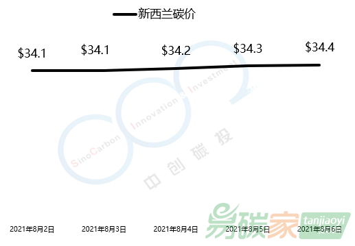 2021年8月2日至8月6日,新西蘭碳價(jià)本周由34.1美元/噸小幅上漲至34.4美元/噸。