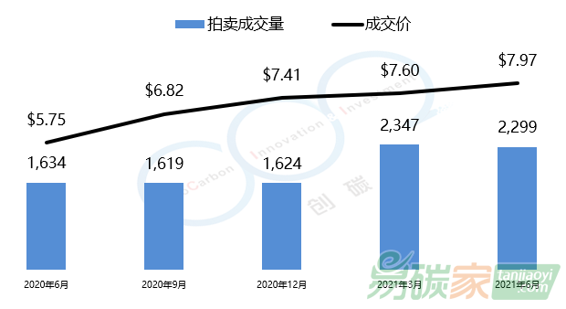 RGGI碳市場的初始配額發(fā)放以拍賣為主,每個(gè)季度舉行一次拍賣。2021年第二季度拍賣成交均價(jià)為$7.97美元,較上一季度漲幅為4.9%。RGGI該次拍賣總成交量為2299萬噸。以下是由中創(chuàng)碳投統(tǒng)計(jì)的RGGI近一年的交易情況。