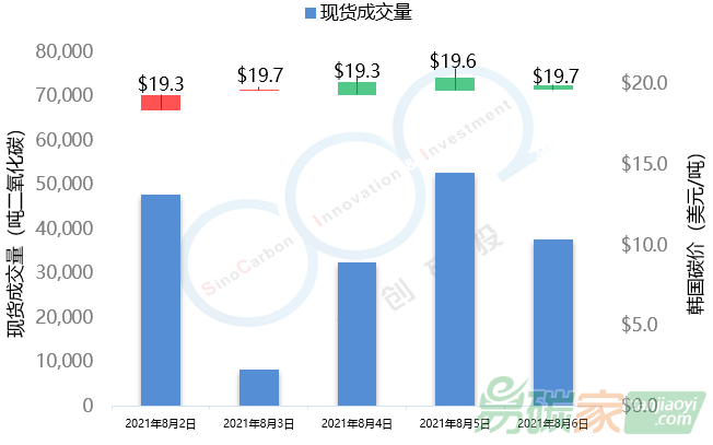 2021年8月2日至8月6日,本周韓國碳價(jià)由19.3美元/噸上漲至19.7美元/噸。韓國碳市場本周成交量近18萬噸,遠(yuǎn)高于上周的4萬噸水平。