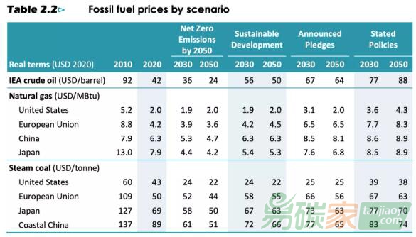 減排措施,2050年不能實現(xiàn)凈零排放),那么IEA預測2050年各類化石能源的價格是: