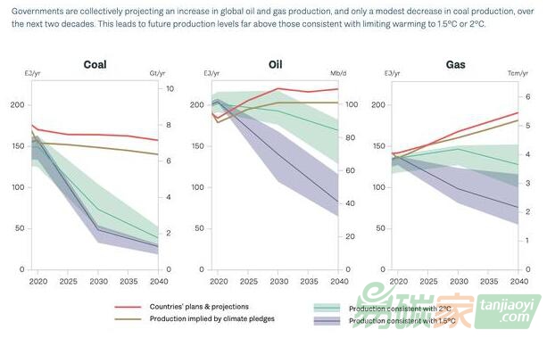 在接下來的二十年中,預(yù)計各國的石油和天然氣產(chǎn)量還將增加,只有煤炭產(chǎn)量會小幅下降。綜合看來,基于各國的生產(chǎn)計劃和相關(guān)產(chǎn)量預(yù)測,全球化石燃料總產(chǎn)量會持續(xù)增加至2040年,生產(chǎn)差距因此也將持續(xù)擴大。