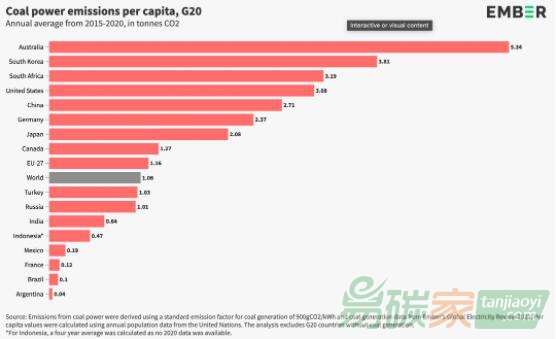 澳大利亞的人均煤炭排放量是 G20 和世界上最高的,每年排放 5.34 噸二氧化碳,幾乎是中國人的 2 倍。韓國的人均煤炭排放量在 G20 中排名第二,為每年 3.81 噸二氧化碳。美國是 G20 中人均煤炭排放量第四高的國家,每年排放 3.08 噸二氧化碳;僅次于排名第三的南非(3.19噸)。美國人平均從煤電中排放的二氧化碳幾乎是全球平均水平的 3 倍。