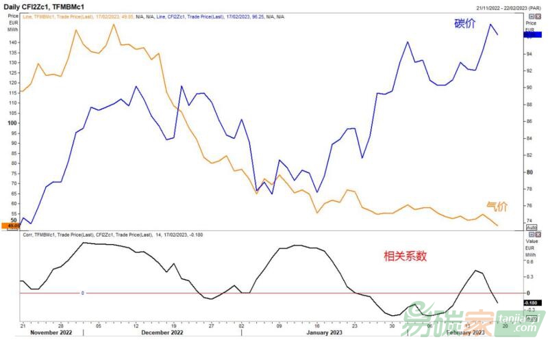 碳配額來(lái)套現(xiàn)提高流動(dòng)性。此外,沖突升級(jí)和對(duì)于歐洲經(jīng)濟(jì)形勢(shì)的擔(dān)憂也使得機(jī)構(gòu)投資者減少對(duì)歐元掛鉤資產(chǎn)的敞口,出售碳配額。下圖顯示了近期內(nèi)碳價(jià)和氣價(jià)的走勢(shì)以及相關(guān)系數(shù),近期內(nèi)跌落至負(fù)值。這反映了,氣價(jià)下跌,使得企業(yè)或者投資機(jī)構(gòu)獲得了多余的資金,可以來(lái)采購(gòu)碳配額,推高了碳價(jià),二者負(fù)相關(guān)。這也反映了近期氣價(jià)暴跌,碳價(jià)上漲,主要還是碳