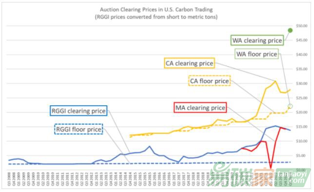 數(shù)據(jù)源于 RGGI, CARB, MassDEP, Wash. Dept. of Ecol., EDF