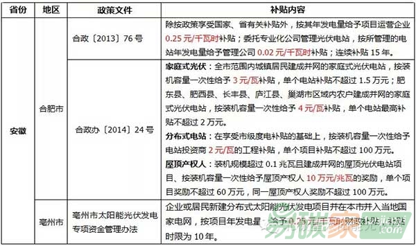 合肥市對光伏項目的補貼,有度電補貼的形式,但更多的是以初始投資補貼為主。在現(xiàn)有的投資水平下,初始投資的補貼力度還是很大的。毫州市的雖然沒有找到文件原文,但是在財政部網(wǎng)站有發(fā)布相關內容,所以補貼信息還是靠譜的!