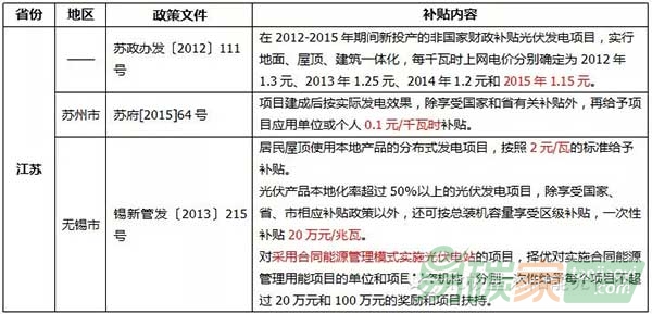 江蘇光伏補貼政策最大的亮點無錫市是對光伏制造、EPC企業(yè)的支持,采用合同能源管理模式實施光伏電站項目的,一次性給予項目獎勵。而蘇州市政府5月6日才公布分布式光伏補貼政策,蘇州市除享受國家和省有關補貼外,再給予項目應用單位或個人0.1元/千瓦時補貼,暫定補貼期限為三年。