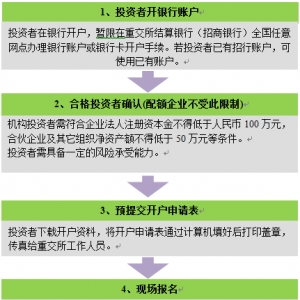 (一)投資者在銀行開(kāi)戶,暫限在重交所結(jié)算銀行(招商銀行)全國(guó)任意網(wǎng)點(diǎn)辦理銀行賬戶或銀行卡開(kāi)戶手續(xù)。新開(kāi)招商銀行賬戶達(dá)正??捎脿顟B(tài)大概需5個(gè)工作日,因此可同步開(kāi)始重交所碳排放賬戶開(kāi)戶流程。若機(jī)構(gòu)投資者已 ...