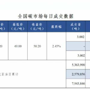 今日全國碳市場碳排放配額(CEA)掛牌協(xié)議交易成交量3,002噸,成交額150,698.00元,開盤價49.00元/噸,最高價50.20元/噸,最低價49.00元/噸,收盤價50.20元/噸,收盤價較前一日上漲2.45%。今日無大宗協(xié)議交易。今日 ... ...