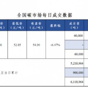 今日全國(guó)碳市場(chǎng)碳排放配額(CEA)掛牌協(xié)議交易成交量60,000噸,成交額3,294,000.00元,開(kāi)盤價(jià)52.85元/噸,最高價(jià)59.00元/噸,最低價(jià)52.85元/噸,收盤價(jià)54.90元/噸,收盤價(jià)較前一日下跌6.47%。今日無(wú)大宗協(xié)議交易。今 ... ...