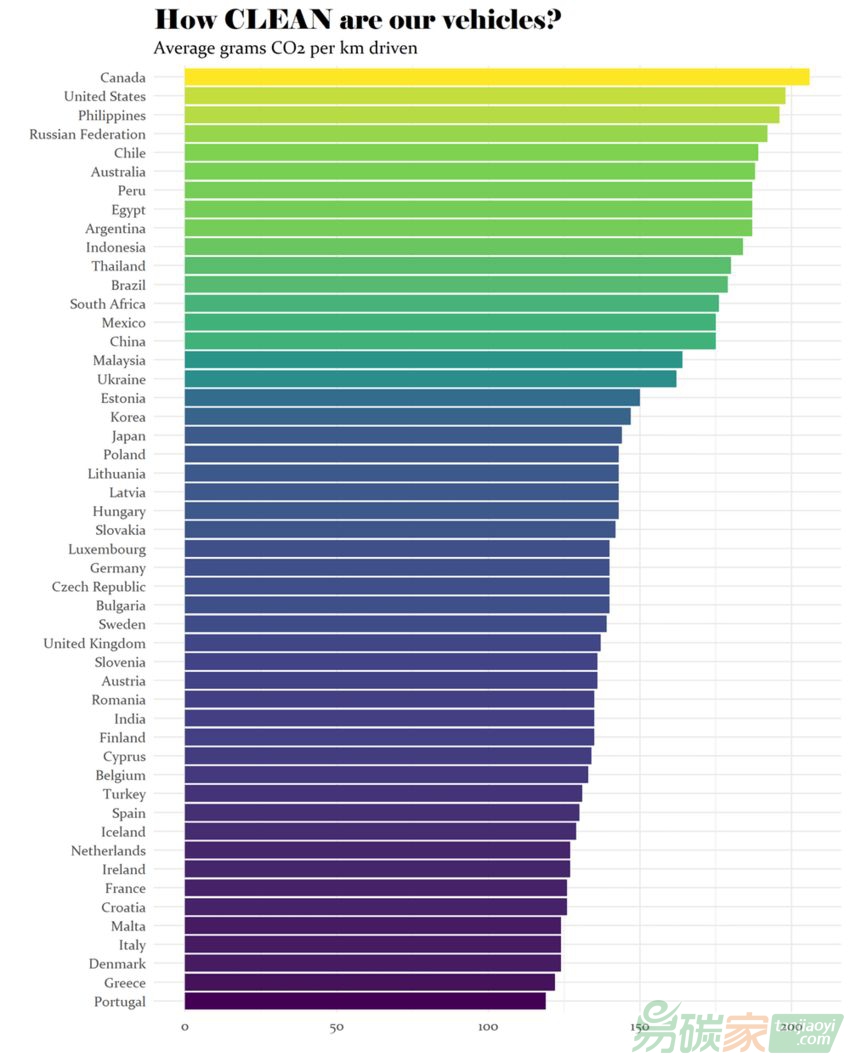 根據(jù)國(guó)際能源署(IEA)的全球汽車燃油經(jīng)濟(jì)研究計(jì)劃(The Global Fuel Economy Initiative)的數(shù)據(jù)(全球輕型車統(tǒng)一測(cè)試規(guī)程),2017年全球各經(jīng)濟(jì)體輕型燃油汽車平均碳排放如下:加拿大:206克/公里美國(guó):198克/公里 ... ...